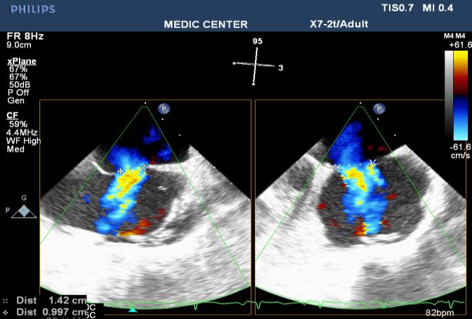 Figure 35. Multiplane 2DTEE with color shows the papillon sign of defect
