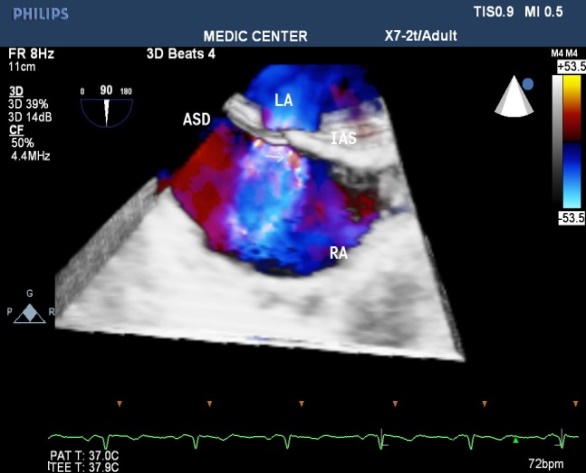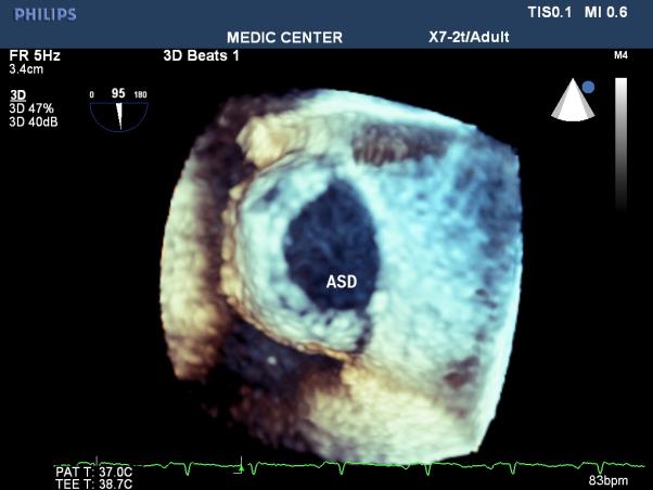 Three-Dimensional (3D) TEE enables improved visualization of ASDs using unique en face representation of the interatrial septum. Three-Dimensional (3D) TEE provides the valuable information including shape, size of defect, its rims prior to perform transcatether device closure.