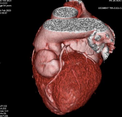 Case Endocarditis of pulmonary valve is very rare one, the rough systolis murmur at left sternal border resulted in a false diagnosis of disease as small VSD. Patient then had been sent to our department one year later to pratice TTE and TEE because of fever. TTE, 2D TEE then 3D TEE consecutively was done. Vegetation of 11x5mm in size recorded from parasternal shorst axis view TTE and 2D TEE, then we found a mobile vegetation with greater size about 14x7mm associated with dilated pulmonary trunk of 35mm in diameter and a subpulmonary valve aneurys m of 25x 36mm. MDCT-640 was indicated and detected a subpulmonary valve aneurysm of 27x38mm and pulmonary trunk dilatation of 40mm in diameter. Surgical plasty of pulmonary valve and aneurysmal ressection were performed (Figures 54-57).