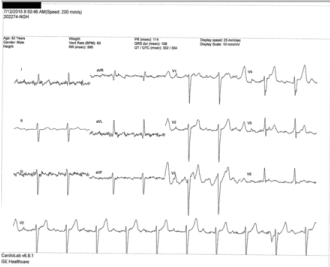 Brugada syndrome is characterized by a hereditary anomaly in the sodium ion channel (mutation of the SCN5A gene) identified by a wide QRS associated with ST segment/J point elevation and T wave inversion in the right precordial leads. Ventricular tachycardia and sudden cardiac death can be associated with this condition.