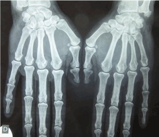 Figure 4: Radiography of hands showing erosions in the left radial extremity, in the right carpe, in the first left inter-phalangeal joint and in the second and third right metacarpophalangeal joint.