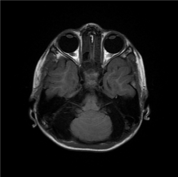 Figure 2. MRI of the posterior fossa demonstrates the absence of the cerebellar vermis with complete fusion of the cerebellar hemispheres Also, notice the absent septum pellucidum giving a mono-ventricle appearance