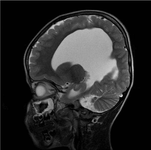 Figure 1. MRI shows the fusion of cerebellar hemispheres with absent vermis. The 4th ventricle is small and has diamond shaped