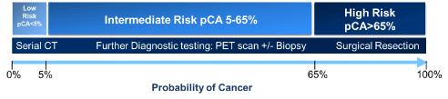 Intermediate-risk nodules, defined by a probability of malignancy of 5-65% using published risk calculators, constitute almost one-half of the pulmonary nodules identified by chest CT scan. These nodules require further diagnostic evaluation because of the concern for lung cancer. Adjuvant testing with positron emission tomography (PET) imaging or needle biopsy can help to characterize nodules with an intermediate probability of malignancy. However, the expense, modest specificity, and low yield of PET imaging, and the potential complications of needle biopsies affect the usefulness of these approaches. Even these minimally invasive procedures carry significant risks and cause anxiety to the patient, while the cost of a diagnostic evaluation increases 28-fold when a biopsy is performed [2,3].