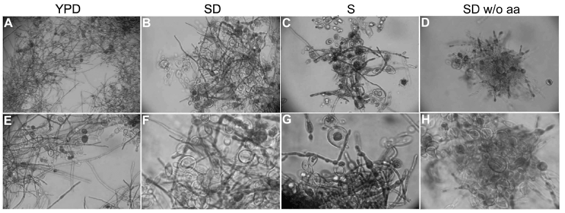 Figure 3. Amino acid starvation inhibit P. brasiliensis dimorphism. P. brasiliensis yeast cells grown on minimal media without without amino acids (SD w/o aa) showed inhibition of conversion from Y to M form, when compared to the same cells grown in YPD, SD ou SD media without glucose (S). The assay was repeated independently more than 5 times. A – 10X magnification; B, C, D and E – 40X magnification; F, G and H -100X magnification.