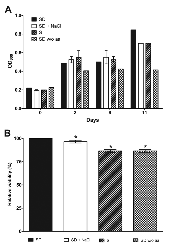 Figure 4. P. brasiliensis growth and viability is preserved upon osmotic and nutritional stress. A) P. brasiliensis growth was evaluated during stress (1M NaCl, glucose and amino acids deprivation) by spectrophotometric measurement at OD600, showing that cells have normal growth during tested conditions. B) P. brasiliensis metabolic activity was assessed quantitatively using MTT reduction assay and we observed a little decrease in viability upon stress, being most cells still viable. Metabolic activity in SD media was taken as 100%. Results shown were the average of three independent experiments ± SD. * p< 0.05 when compared with SD media.