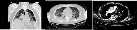 Figure 3. Coronal (left) and axial (right) chest CT imagings in a 63 years old, male patient, affected with SARS-CoV2. (C)Thrombo-embolic aspect (arrow) in an axial chest CT imaging with contrast in a 63 years old, male patient, affected with SARS-CoV2