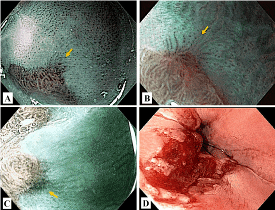 Figure 2. A, B and C. Endoscopic microerosions; D. Post esophageal biopsies.