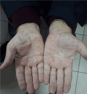 Figure 1. Faint, erythematous, ovaloid scaly rashes over the palms