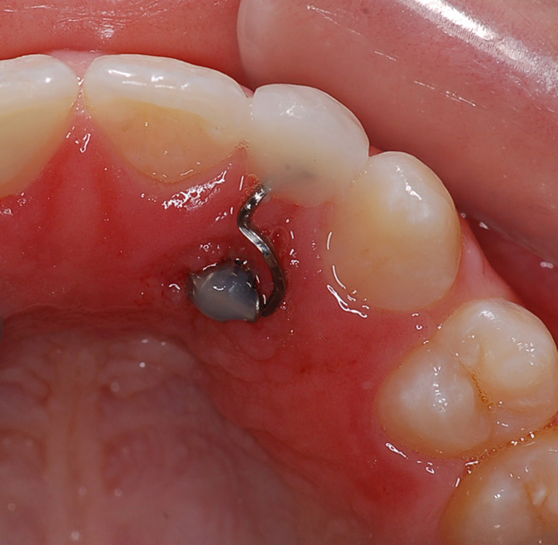 After a mild infiltration anesthesia, an Aarhus mini-implant®[i] with a bracket-like head and a high collar is inserted perpendicular to the alveolar process palatally in the edentulous area, approximately corresponding to the coronal third of the length of the roots of the adjacent teeth.