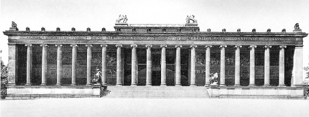 Mies was a confessing admirer and pupil of Schinkel. The most famous building of Schinkel is the Old Museum vis-á-vis the once and prospective royal castle. The museum houses the royal antiques collection and was supposed to not only provide a dignified home for the treasure, but to balance also the architectural heavyweight of the castle over there. Schinkel dealt with the challenge in a spirit remarkable close to that of the Neue Wache. He forms the front vis-á-vis the castle as a mighty colonnade exceeding the temple front in the number of columns and in the very extension of the building. He then puts the colonnade on a base that is alien to the temple and, in addition, crowns the entablature in a way that would have been unthinkable in antiquity: with a row of eagles, the militaristic emblem of Prussian kingdom. He thus answers the imperial gesture of the castle with its own symbolism and display of imperial pretention (Figure 23).