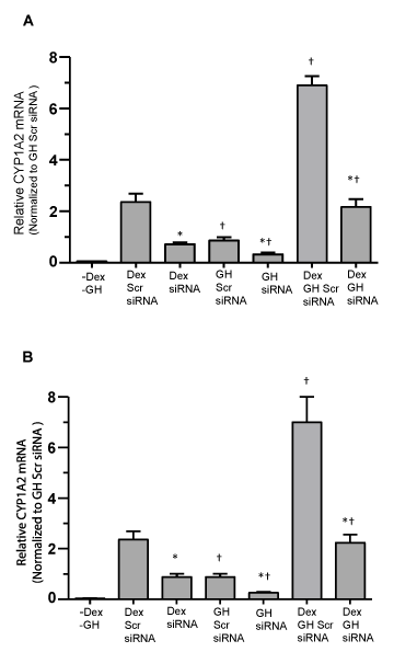 Figure 4. Hormonal regulation of CYP1A2 mRNA levels in NF-1 and USF-1 proficient and deficient HepG2 cells. Following 50–70% confluency, HepG2 cells were transfected with either the control non-specific scrambled (Scr) siRNA (proficient) or NF-1 or USF-1 knockdown siRNA (deficient) and 24 hours later cells were either exposed to continuous dexamethasone alone (Dex) or continuous growth hormone alone (GH) or both hormones (Dex+GH) for 2 days after which the cells were harvested and analyzed. (A) graphic representation of CYP1A2 mRNA levels (qRT-PCR) in NF-1 proficient and deficient HepG2 cells and the signals were normalized with GAPDH mRNA (internal control). (B) A graphic representation of CYP1A2 mRNA levels (qRT-PCR) in USF-1 proficient and deficient HepG2 cells and the signals were normalized with GAPDH mRNA (internal control). Each data point is a mean ± S.D. from 5 or more independent experiments. *P < 0.01 compared the effects of the knockdown siRNA with control cells exposed to the same hormone treatment. †P < 0.01 compared with dexamethasone alone in cells transfected with the same siRNA.