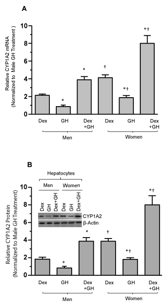 Figure 5. Growth hormone and dexamethasone effects on sex-dependent regulation of human CYP1A2 in cultured primary human hepatocytes. Adult hepatocytes from men and women were either exposed to continuous dexamethasone alone (Dex) or continuous growth hormone alone (GH) or both hormones (Dex+GH) or vehicle (-Dex-GH) alone for 5 days in culture, after which the cells were harvested and processed for further analysis. (A) A graphic representation of relative CYP1A2 mRNA levels in hepatocytes and the signals were normalized with GAPDH mRNA (internal control). (B) A graphic representation of relative CYP1A2 protein levels and a representative immunoblot image of CYP1A2 protein (insert). The protein signal values for vehicle (-Dex-GH) treatments were so low as to be barely detectable and are not included in the figure. Respective loading controls (β-actin) are presented in the figure. Each data point is a mean ± S.D. for cells from 5 or more individuals. *P<0.01 compares to the dexamethasone alone treatment of the same sex. †P<0.01 compares women with men exposed to the same dexamethasone treatment.