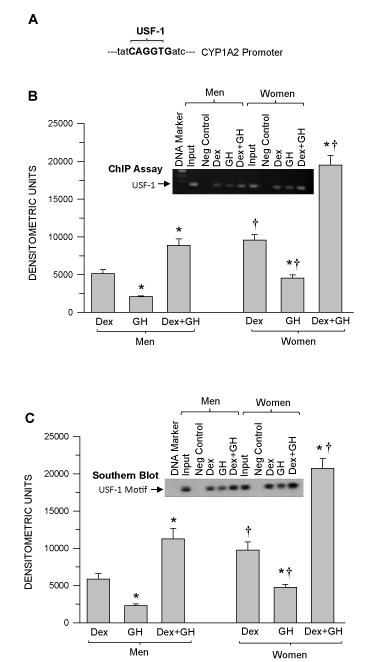 Figure 8. Mapping the USF-1 binding region on the human CYP1A2 upstream sequence and sex-dependent hormonal regulation of USF-1binding to the CYP1A2 upstream sequence and confirmation of the occupied USF-1 binding motif in the CYP1A2 upstream sequence in hepatocytes derived from adult men and women. Adult hepatocytes from men and women were either exposed to continuous dexamethasone alone (Dex) or continuous growth hormone alone (GH) or combination of Dex and GH or vehicle (-Dex-GH) alone for 5 days in culture. Next, the cells were fixed with formaldehyde, lysed and the chromatin was sheared and processed for further analysis. (A) USF-1 binding location on the CYP1A2 upstream sequence (Bold). (B) A graphic representation of the ChIP-PCR amplified signal and a representative agarose gel image of the ChIP assay. (C) A graphic representation of the occupied USF-1 binding motif and a representative Southern blot image (insert). Rabbit IgG served as a negative control and input chromatin as a positive control. The ChIP signal values for vehicle (-Dex-GH) treatment were so low as to be barely detectable and are not included in the figure. Each data point is a mean ± S.D. for cells from 5 or more individuals. *P<0.01 compares to the dexamethasone alone treatment of the same sex. †P<0.01 compares women with men exposed to the same treatment.