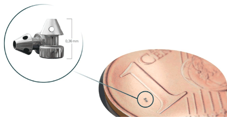 ▲ iStent inject is a trabecular micro-bypass system with two preloaded implants made of heparin-coated, non-ferromagnetic titanium. The implants are very small. At 360 µm x 230 µm, they are the smallest medical devices used in humans. They have two ends; at one end, the inlet opening protrudes into the anterior chamber, while the other end opens out into the Schlemm’s canal in a pointed conical shape with four lateral outlet openings. The middle part of the stent is fixed in the trabecular meshwork. The implants connect the anterior chamber with Schlemm’s canal. They bridge the point of highest outflow resistance, the juxta-canalicular trabecular meshwork, the Fontana spaces, facilitating the outflow of aqueous humor there. From the injector shown bottom left the two implants are released.