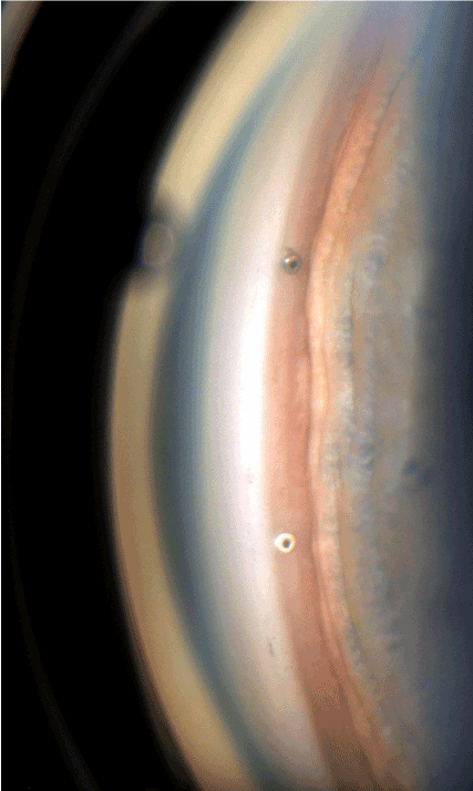 Figure 2. ▲ Two in Schlemm’s canal implanted iStents inject. The implantation is ab interno in between the pigmented and unpigmented trabecular meshwork, in the nasal inferior quadrant, where the collector channels density is highest.