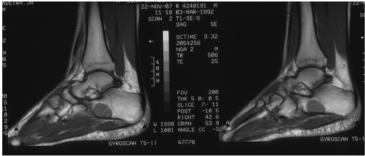 A decision is made to conduct magnetic resonance imaging (MRI) of the foot to identify the specific type of injury. The presence of a well-defined lytic lesion is confirmed, approximately 30x22x20 mm in the anteroinferior part of the calcaneus, with hypointense sequences enhanced on T1, which includes hyperintense sequences with fat suppression.