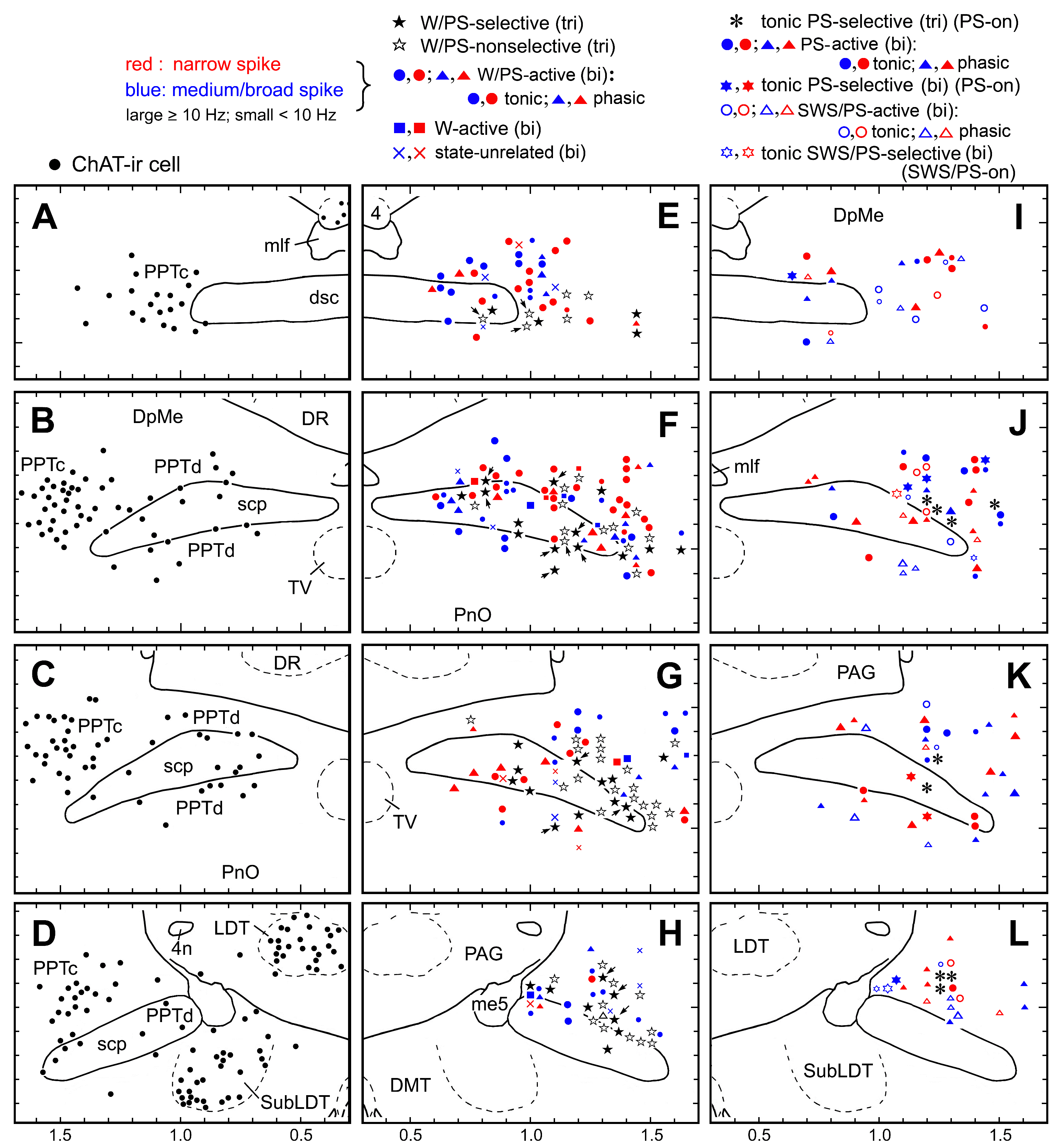 Figure 2. Camera lucida drawings of coronal brain sections (four different planes arranged in rostral to caudal order). (A-D) Distribution of ChAT-ir cholinergic neurons (filled circles). (E-H) Distribution of triphasic (tri) W/PS-active neurons (filled and nonfilled stars) and biphasic (bi) W/PS-active (filled circles [tonically discharging] and triangles [phasically discharging]), W-active (filled squares), and state-unrelated (crosses) neurons. Filled and nonfilled stars indicate, respectively, triphasic W/PS-selective and W/PS-nonselective neurons. The arrows indicate triphasic W/PS-active neurons discharging in association with a phasic cortical EEG potential. (I-L) PS-active and SWS/PS-active neurons. Asterisks indicate triphasic PS-on neurons, discharging tonically and selectively just prior to, and during, PS. Filled circles and triangles indicate biphasic PS-active neurons discharging, respectively, tonically or phasically during PS. Filled stars indicate biphasic PS-on neurons discharging tonically and selectively just prior to, and during, PS. Nonfilled circles and triangles indicate SWS/PS-active neurons discharging, respectively, tonically or phasically during PS. Nonfilled stars indicate biphasic SWS/PS-on neurons discharging tonically and selectively at high rates during both SWS and PS. In E-L, neurons showing a triphasic broad action potential are shown in black, while those showing a biphasic narrow or medium-to-broad action potential are shown, respectively, in red or blue. Large and small symbols indicate, respectively, rapidly firing (≥ 10 Hz, fast) or slowly firing (< 10 Hz, slow) neurons. 4, trochlear nucleus; 4n, trochlear nerve; DMT, dorsomedial tegmental area; DR, dorsal raphe nucleus; DpMe, deep mesencephalic nucleus; dsc, decussation of the superior cerebellar peduncule; LDT, laterodorsal tegmental nucleus; me5, mesencephalic trigeminal tract; mlf, medial longitudinal fasciculus; PAG, periaqueductal gray; PnO, oral pontine reticular nucleus; PPTc and PPTd, pedunculopontine tegmental nucleus, pars compacta and dissipata, respectively; scp, superior cerebellar peduncle; SubLDT, sublaterodorsal tegmental nucleus; TV, ventral tegmental nucleus.
