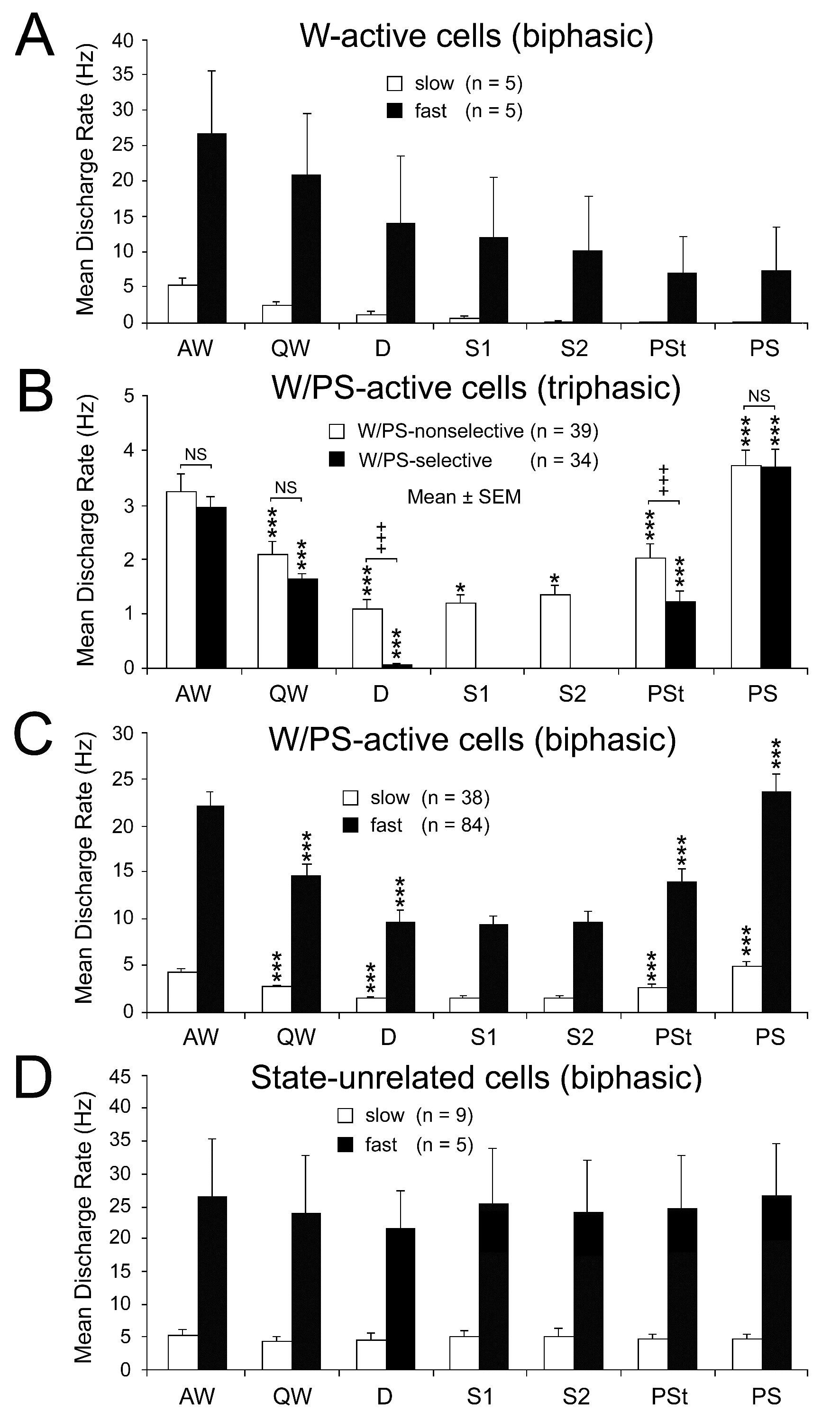 Figure 5. Mean spontaneous discharge rates of biphasic W-active (A), triphasic W/PS-active (B), biphasic W/PS-active (C), and biphasic state-unrelated (D) neurons recorded in the PPT during the sleep-wake cycle. The biphasic neurons were subdivided into two groups (slow and fast) on the basis of their low (< 10 Hz) or high (≥10 Hz) spontaneous firing rate during W. The triphasic neurons were subdivided into two groups on the basis of their nonselective (white) or selective (black) discharge during EEG activation occurring during W and PS. The difference in discharge rate across the sleep-wake states was highly statistically significant (P<0.0001, Friedman) for the 4 W/PS-active neuron groups, but not for the slow state-unrelated neuron group (P < 0.76, Friedman); statistical analysis was not carried out on neuron groups with a small number (n) of cells (< 6). A significant difference in discharge rate between two successive states is indicated by asterisks (*P<0.05; **P<0.01, *** P<0.001, Wilcoxon). In (B), a significant difference in discharge rate in each state between W/PS-selective and W/PS-nonselective neurons is indicated by crosses (+++P<0.001, Mann-Whitney).