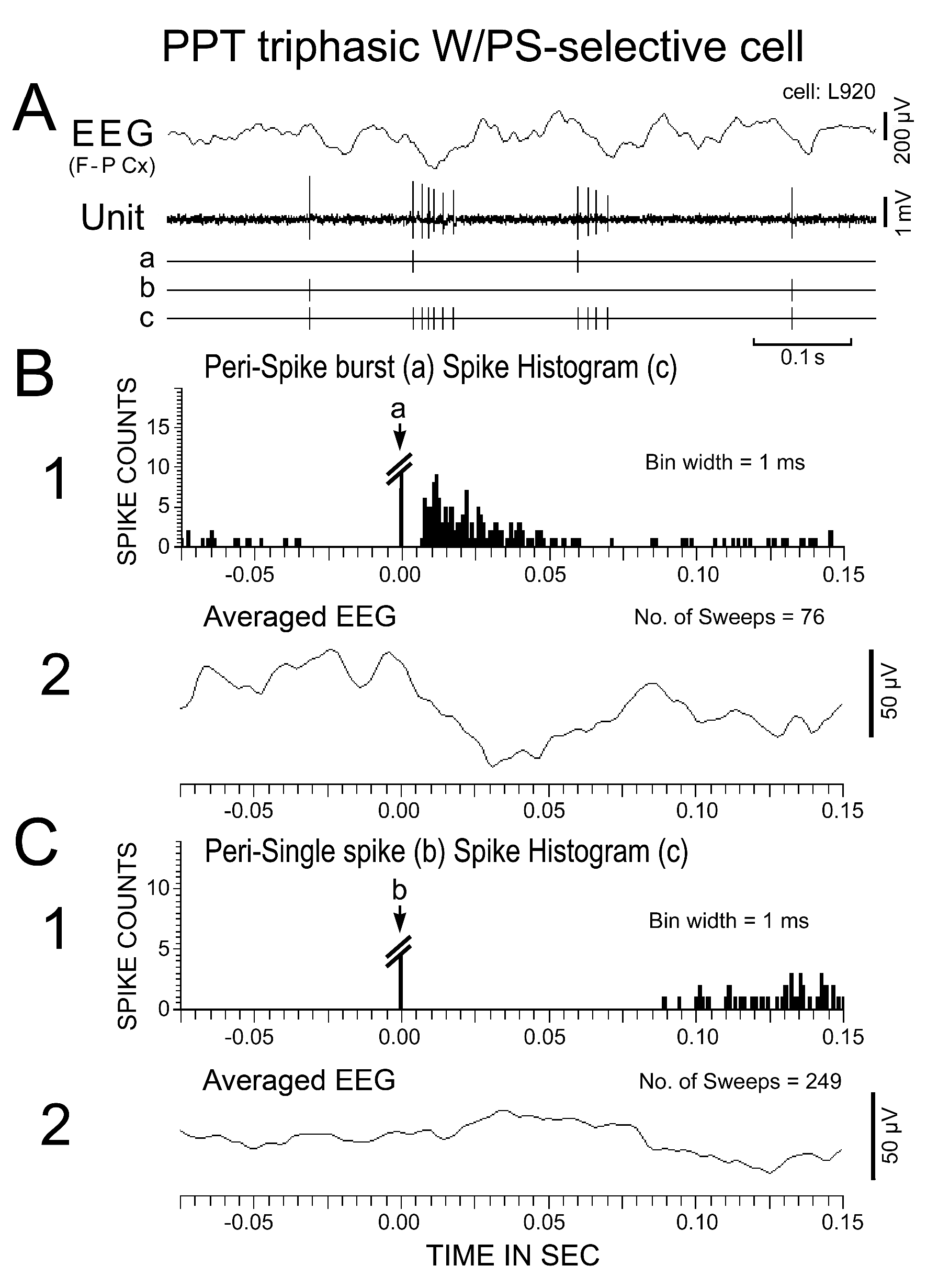 Figure 8. Activity of a triphasic W/PS-selective neuron recorded in the PPT during PS. (A) The spontaneous spike discharges (Unit, shown in “c”) were divided into two classes on the basis of a single isolated discharge (shown in "b") or burst discharges (the first spike within the burst being indicated in "a"). (B and C) Spike-triggered averaging of spike discharges (1) and of the cortical EEG (2) triggered by either the first spike within a burst (B) or a single isolated spike (C) occurring during PS. Note that bursting discharges were associated with a phasic negative EEG potential, whereas single isolated spikes were not.