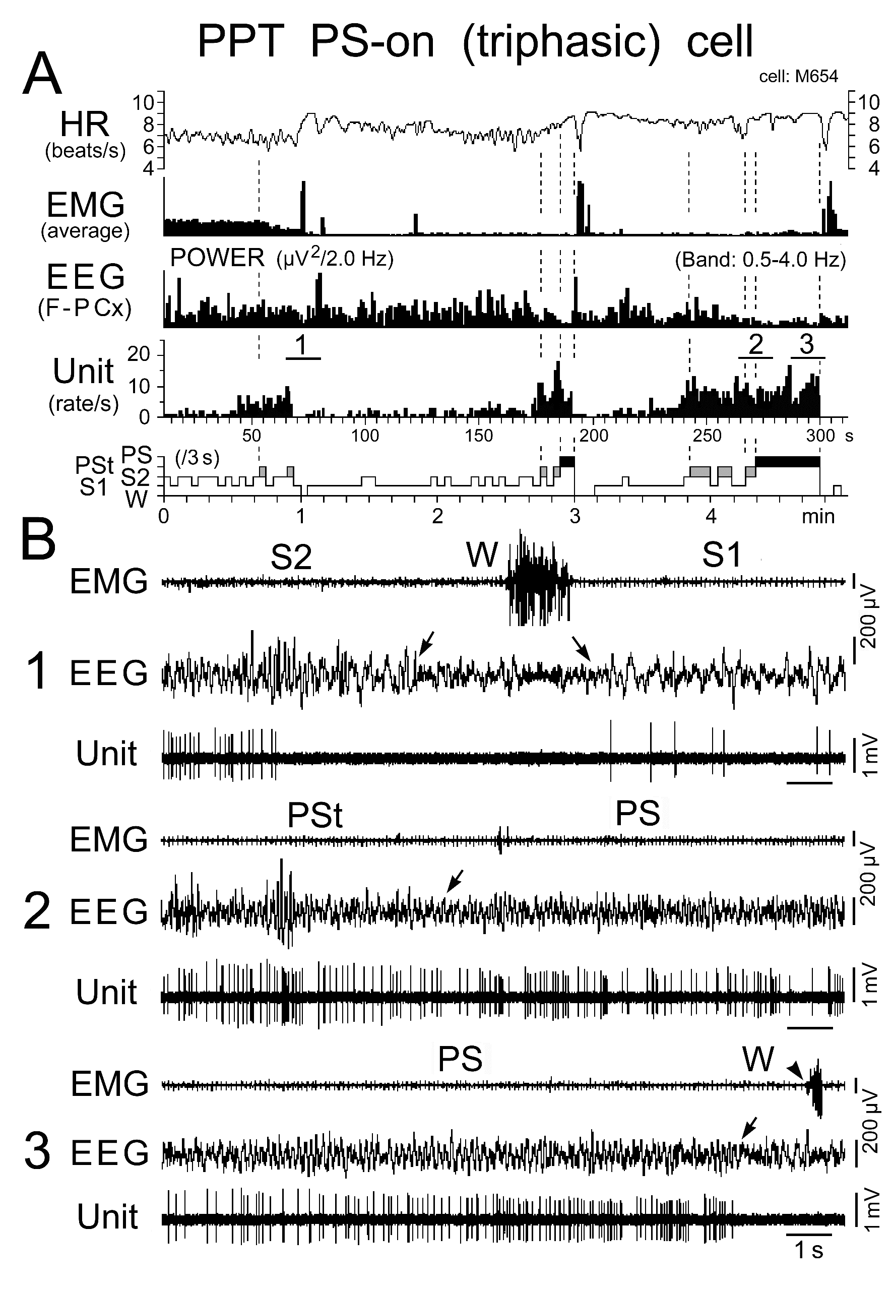 Figure 14. Activity of a biphasic PPT PS-on neuron during the sleep-wake cycle. The three traces in (B) are from the periods indicated by the bars labeled "1", "2", and "3" in (A). The dotted lines in (A) indicate the state transitions from SWS to PSt, PSt to PS, and PS to W. The arrows on the EEG indicate the state transitions, while the arrowhead on the EMG indicates the return of EMG activity at the transition from PS to W. Note that the PS-on neuron discharged tonically at high rates in parallel with a progressive increase in HR and a progressive decrease in EEG delta power. The neuron maintained sustained tonic discharge throughout the PS episode, characterized by low EEG delta power, sustained theta wave activity, elevated HR, and low muscle tone, and stopped firing before the end of PS, characterized by the interruption of rhythmic theta activity and a marked fall in HR, which was followed by recurrence of EMG activity.