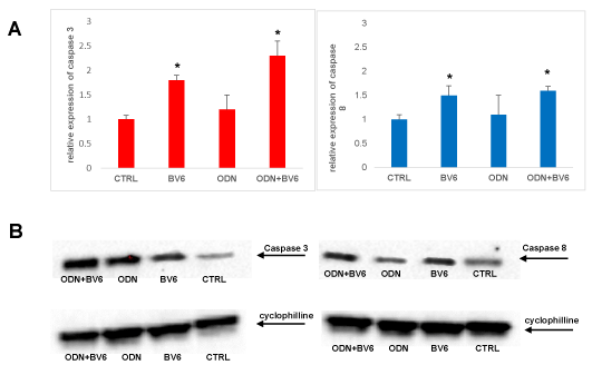 Figure 3A. RASF were cultured in the presence of RA SF pool (1:8 dilutions in culture medium) for 7 days, 48 hours before was added ODN 5 mM and BV6 40 mM. Total cellular RNA was extracted with the Total RNA Purification Kit (Norgen Biotek Corp) and reverse transcribed as materials and methods described. Data were analysed according to the comparative Ct method and were normalized by GAPDH expression, according to the equation: 2-△Ct [△Ct = Ct (caspase 3, caspase 8) − Ct (GAPDH)]. Data are expressed as mean ± SD. *p < 0.05 vs CTRL. B Extracts from RASF treated with RASF cultured in the presence of RA SF pool (1:8 dilution in culture medium) for 7 days, 48 hours before was added ODN 5 mM and BV6 40 mM, were prepared and levels of caspase 3 and 8 were analysed by western blot. Arrows indicate the mobility of cleaved caspases 3 and 8 (18 kDa). Cyclophylline was used as a loading control (24 kDa). Densitometric analysis of the immunoblots was performed with Chemidoc Image Lab software (Bio-Rad). Densitometric analysis shows the ratio of caspase/cyclophilline protein expression ± s.e.m of the mean from four independent experiments. *p < 0.05 indicates statistically significant difference vs RASF alone.