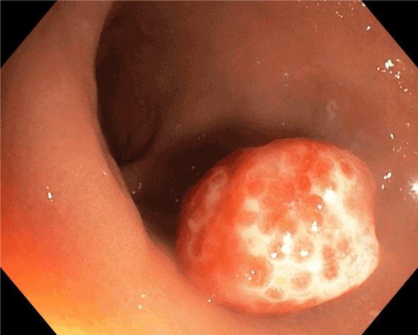 Although these lesions are typically located in the rectum and bleeds, they rarely might be presented as large polyps.