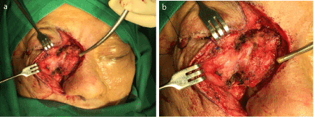 Figures 6a & 6b: Intraoperative photo of right lacrimal sac tumour