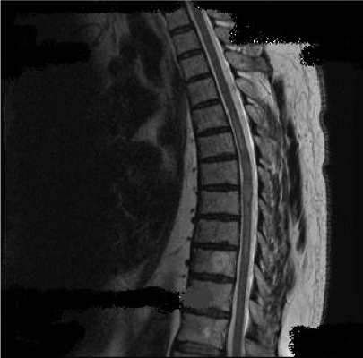 Figure 1: Intramedullary high signal lesion on T2 sequence extended from T1 to T6 vertebral segment.