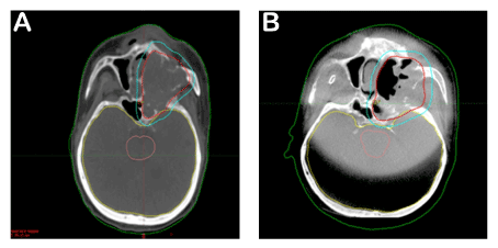 Figure 4. CT images: This image shows tumor volume before treatment. Red line is surrounding of tumor area (A). Second image displays treatment effect of radioteraphy (B). Please compare to Figure-4A, note decrease of tumor volume