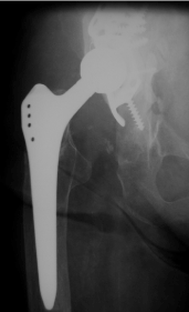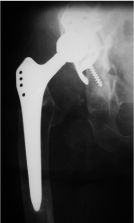 Figure 1. X-ray of the right hip (ap view): Total hip arthroplasty with a stable stem with no signs of loosening, destruction of the greater trochanter and reconstruction of the acetabulum using an acetabular reinforcement ring.
