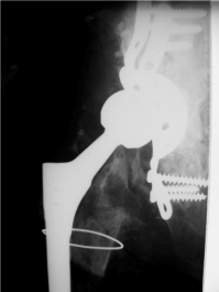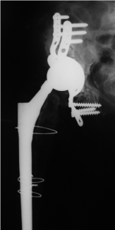 Figure 3. X-ray of the right hip (ap view) shows a dislocated wagner revision stem with 3 cerclage wires and reconstruction of the acetabulum with massive bone transplants.