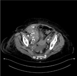 The patient was stabilized and abdominal CT revealed a large hematoma of the right rectus sheath with arterial exavascation from a branch of the right inferior epigastric artery (Figure 1).