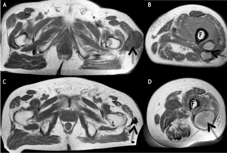 Figure 2. MRI evidence of tumor regression. 2A and 2B, Axial T1-weighted images from initial MRI reveal subcutaneous hypointense mass (arrow, 2A) posterolateral to the left femoral lesser trochanter (L), and two adjacent hyperintense masses (arrow, 2B) posterolateral to the left femoral diaphysis (F). 2C and 2D, Axial T1-weighted images from follow-up MRI demonstrate marked size/signal decrease of the mass (arrow, 2C) posterolateral to the left femoral lesser trochanter (L) as well as coalescence of the masses (arrow, 2D) posterolateral to the left femoral diaphysis (F).