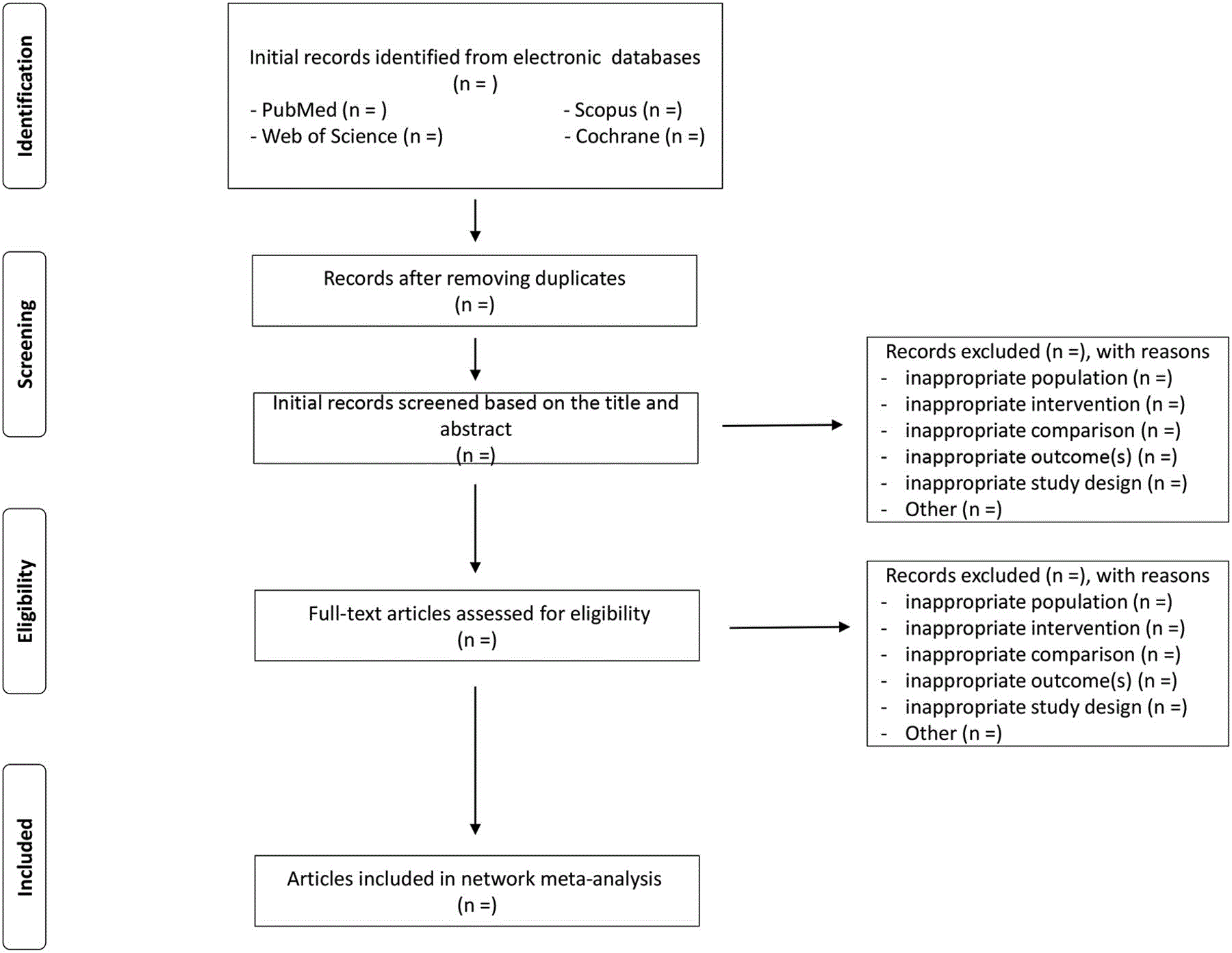 All studies extracted from electronic databases using the search strategy will be imported into EndNote V.X7.5 and duplicates removed. The studies will be examined again manually to find and delete any additional duplicates. The first two authors will select studies independent of each other. Complete articles will be obtained for all titles and abstracts that appear to meet the inclusion criteria or where there is any uncertainty. Reasons for exclusion will be coded as one or more of the followings: (1) inappropriate population, (2) inappropriate intervention, (3) inappropriate comparison, (4) inappropriate outcome(s), (5) inappropriate study design. After selection, the first two authors will review their selections and resolve any discrepancies by consensus. If consensus cannot be reached, the third author will be consulted. The overall agreement rate prior to correcting discrepant items will be calculated using Cohen’s kappa (κ) statistics. Once discrepancies are resolved, the overall precision of searches will be calculated by dividing the number of studies included by the total number of studies screened after removing duplicates. The number needed to read will then be calculated as the inverse of the precision. A flow diagram that depicts the search process and an online supplementary file that includes a reference list of all studies excluded (including the reason(s) for exclusion) will be included in the study. The proposed structure for the flow diagram is shown in Figure 1.