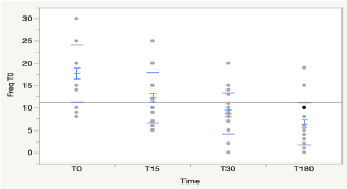 Wilcoxon Test T0 vs T15 p< 0.0027; T0 vs T30 p<0.0006; T15 vs T30p NS
