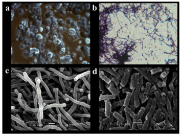Figure 2. Micrographs of S. scabrisporus at: a) stereoscopic microscope (X250); b) Optical microscope (X1,000); c) SEM micrograph (X10,000) of lineal mycelia; d) SEM micrograph (X15,000) of spore formation.