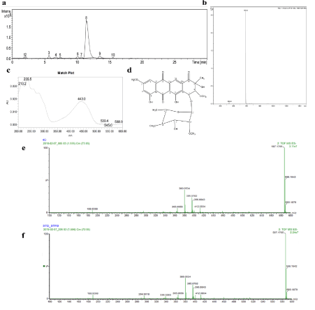 Chromatography and HPLC/UV/ESI-MS analysis of the S scabrisporus NF3 organic extracts identified the major fraction with cytotoxic activity as StefB, a bioactive anthracycline initially reported in 1974 in Streptomyces elgreteus [34]. Similar fragmentation patterns of the isolated compound with those of a commercial standard of StefB, supported further the authenticity of the cytotoxic compound.