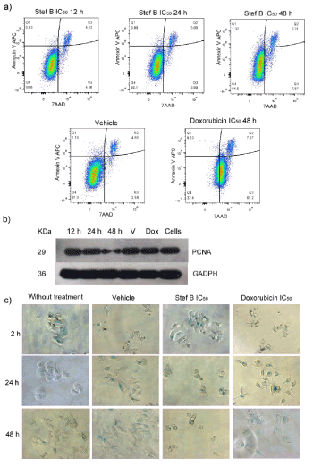 Figure 4. Effect of StefB on MCF7 cells. a) Flow cytometry analysis evaluating apoptosis and necrosis; b) Western Blot analysis of the expression of the proliferation marker PCNA (find at 29 KDa) using glyceraldehyde-3-phosphate dehydrogenase (GADPH) as positive control (at 36 KDa); c) Micrographs showing morphological changes of the cells stained with β-galactosidase.