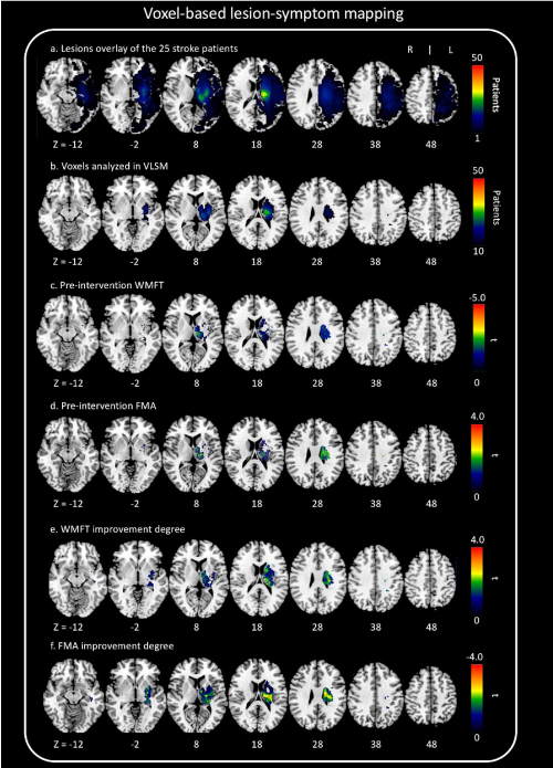The overall distribution of lesions in our patients is described in Figure 2a. We show exactly which voxels were included in VLSM (Figure 2b). We scaled from 10 to 50 patients.