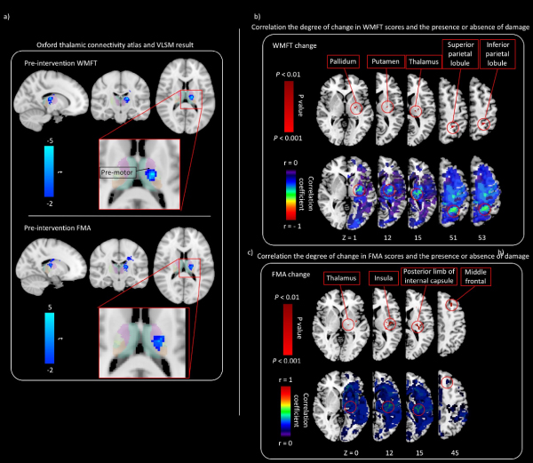 (a) Regions with a strong relationship between pre-intervention WMFT scores and the lesion are shown. The thalamic cluster (colored in red–yellow) is displayed along with probable regions of cortical connectivity, based on the Oxford Thalamic Connectivity Atlas. The predominant relationship is to the premotor cortex. (b) Correlation between the degree of change in WMFT scores and presence/absence of damage. The correlation map shows negative correlation between the degree of change in WMFT scores and lesion. Pixels with significant correlation are located in the pallidum, putamen, thalamus, superior parietal lobule, and inferior parietal lobule. (c) Correlation between the degree of change in FMA scores and presence/absence of damage. The correlation map shows positive correlation between the degree of change in FMA scores and lesion. Pixels with significant correlation are located in t the thalamus, insula, posterior limb of internal capsule, and middle frontal gyrus.