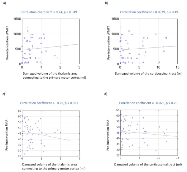- Significant positive correlations are observed between volume of damaged thalamic area connecting to the primary motor cortex and pre-intervention WMFT scores (P < 0.05). (b) Volume of damaged corticospinal tract tissue and pre-intervention WMFT scores were not correlated (P = 0.49). (c) Significant negative correlations are observed between volume of damaged thalamic area connecting to the primary motor cortex and pre-intervention FMA scores (P < 0.05). (d) Volume of damaged corticospinal tract tissue and pre-intervention FMA scores were not correlated (P = 0.29).
