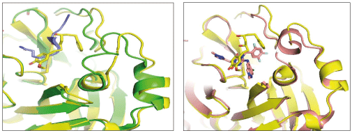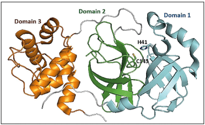 Crystal structures of SARS-CoV-2 Mpro show that the two protomers (306 residues) are non-covalently associated and form a functional homodimer. Each chain of protomer comprises of three domains (domains I, II, and III) (Figure 1a). Domains I (residues 8–101) and II (residues 102–184) are made up of six antiparallel β-barrels [12]. An antiparallel cluster of five α-helices forms domain III (residues 201– 303), which is connected to domain II via a long loop (residues 185–200). The active site cavity where substrate peptide binds, lies in the cleft between domains I and II, which has a Cys-His catalytic dyad involved in the proteolysis of substrates (Figure 1b) [15]. The substrate binding cavity contains a series of pocket (S4, S3, S2, S1, S1’, S2’, S3’, S4’), each one of them accommodates a single amino acid residue (P4, P3, P2, P1(Gln), P1’, P2’, P3’, P1’) of the substrate from N-terminus to C-terminus [16]. The substrate cavity is complete only after dimerization where the N-terminus finger residues 1-7 of other protomer interacts. Mpro inhibitors are broadly classified as covalent and non-covalent, where the non-covalent inhibitors are safe to use because of the presence of reactive groups present in covalent inhibitors. There are several co-crystal structures and reports on reversible and irreversible covalent inhibitors targeting the reactive cysteine, Cys145, and non-covalent inhibitors of Mpro [17-19]. Recently FDA approved a reversible inhibitor, nirmatrelvir against Mpro [20].