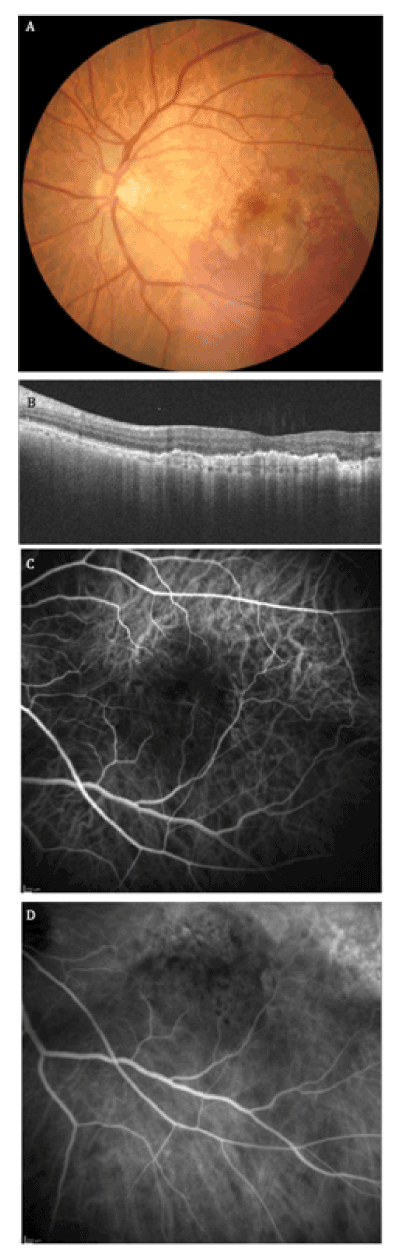 Figure 1. Left Eye on Postoperative Day #1. (A) Fundus photograph reveals subretinal hemorrhage in the inferotemporal macula next to the fovea. (B) OCT is compatible with subretinal and sub-RPE hemorrhage with RPE tear. (C) Early and (D) Late phase of FA shows a hypofluorescent area corresponding to the subretinal hemorrhage with absence of CNVM causing leakage.