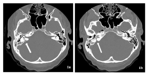 Figure 1. Pre-surgery CT without contrast: post-traumatic pathological pathway between middle ear (in front of the oval window), inner ear and posterior right cranial fossa. Look at arrows to see the transverse petrous temporal bone fracture.