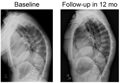 Figure 4. Radiographs show reduction of kyphosis from baseline to 12-month follow-up.