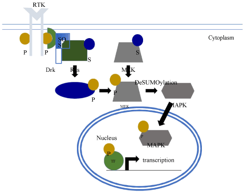 Figure 2. Regulation of RAS/MAPK by SUMO. Upon activation of a receptor tyrosine kinase (RTK), SUMO (S) modification of Ras enhances signaling through the Ras/MAPK pathway and stimulates the deSUMOylation of MEK, SUMO of which initially inhibits its kinase activity. This leads to a phosphorylation cascade, in which Raf phosphorylates (P) MEK and phospho-MEK phosphorylates MAPK. Phospho-MAPK translocate to the nucleus and phosphorylates various transcription factors (TF) altering the transcriptional program of the cell.