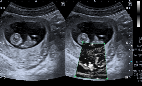 Figure 1. Normal placenta version. Left: B-mode, right – SMI