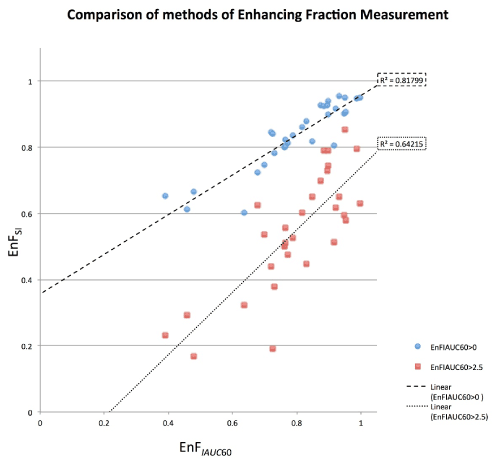 The aims of this study were: 1) to establish the feasibility of acquiring a measure of enhancing fraction based on changes in signal intensity (EnFSI); 2) to compare this with the more established IAUC60 (both EnFIAUC60>0 and EnFIAUC60>2.5) based technique and 3) to assess the relationship of different measurements of EnF with survival in a cohort of GBM patients.