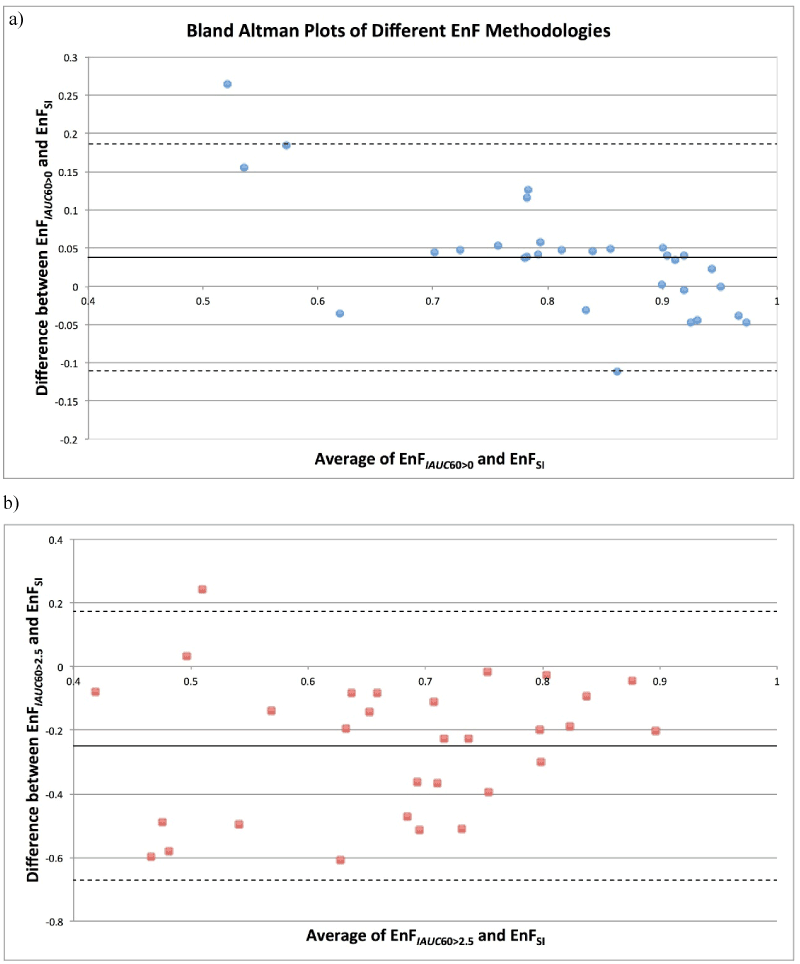 The scatter plots for both EnFIAUC60>0 and EnFIAUC60>2.5 versus EnFSI are shown in Figure 1 and the Bland Altman plots in Figure 2. The results for the Bland Altman analysis are presented in Table 1. For EnFIAUC60>0 versus EnFSI, the paired t-test demonstrated a significant difference between the mean difference between measures and a mean difference of zero, p = 0.011. For EnFIAUC60>2.5 versus EnFSI, the paired t-test demonstrated a significant difference between the mean difference between measures and a mean difference of zero, p <0.001). Excellent intraclass correlation coefficients were demonstrated between EnFSI and both IAUC60 based measurements of EnF (EnFIAUC60>0 ICC = 0.909 and EnFIAUC60>2.5 ICC = 0.883), indicating ‘almost perfect’ consistency of between EnFSI and EnFIAUC60>0 [19]. EnFSI had a tendency to measure slightly lower than EnFIAUC60>0 and markedly higher than EnFIAUC60>2.5 (Figure 1). The lowest values of EnFIAUC60>0 (less than approximately 0.60) demonstrated the greatest discrepancy between EnFIAUC60>0 and EnFSI measures (Figure 3).
